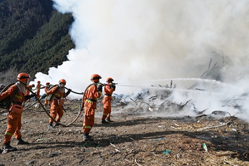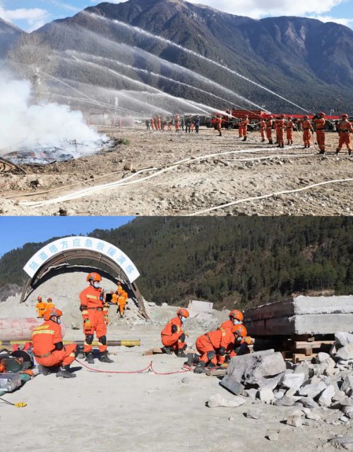 模擬演練背景:12月13日09:50,林芝市巴宜區(qū)覺木路附近兩座高壓輸電塔因地震導(dǎo)致傾倒,電線短路瞬間引發(fā)了森林火災(zāi),熊熊燃燒的大火在林間蔓延。因地震造成周邊地區(qū)部分房屋倒塌,道路、橋梁損毀,通信和電力中斷,地面救援困難重重。
