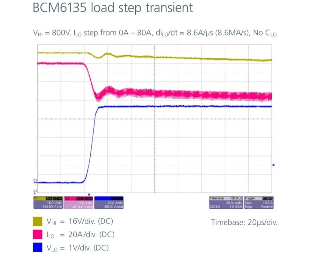 圖 3:BCM6135 的快速負載瞬態(tài)響應(yīng)是支持 12V 負載的關(guān)鍵。瞬態(tài)響應(yīng)為每秒 800 萬安培 (8MA/s)。黃色:輸入電壓 (800VDC),紅色:輸出電壓 (48V),藍色:輸出電流。