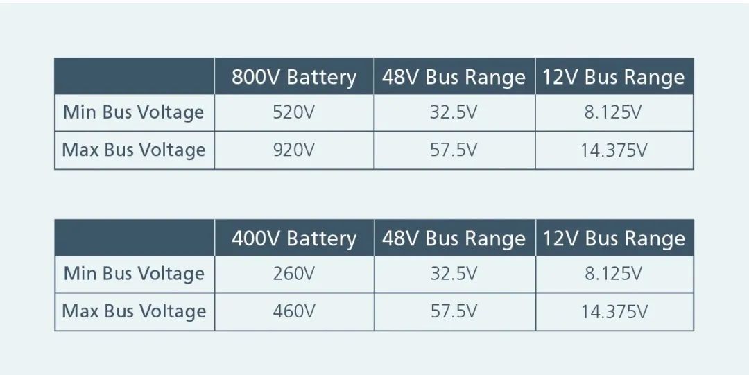 表 1:采用Vicor BCM/NBM 母線轉(zhuǎn)換器技術(shù)的 48V 母線和 12V 母線上的最小電壓和最大電壓。48V 和 12V 電壓范圍均符合 VDA 320 和 LV 124 標準。