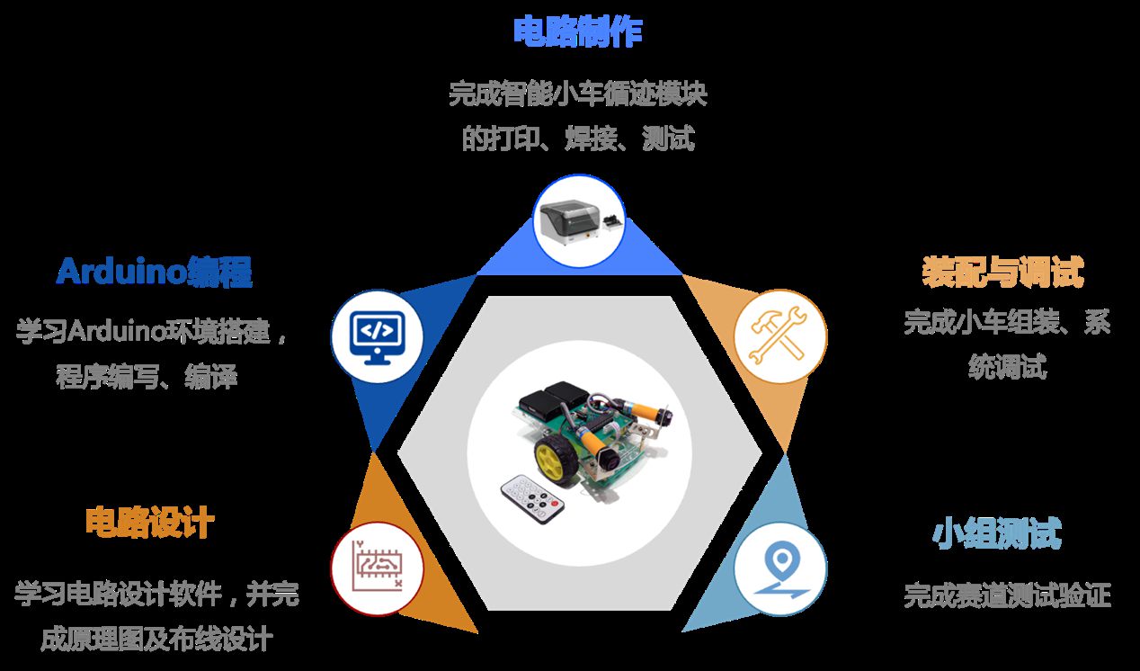 課程基于全要素理念,運用項目式教學(xué)方式,包含電路設(shè)計、PCB制作、電子焊接、Arduino編程、系統(tǒng)裝配調(diào)試、賽道場景驗證等部分,綜合培養(yǎng)及訓(xùn)練學(xué)生在硬件、軟件、系統(tǒng)等全方位的實操能力。