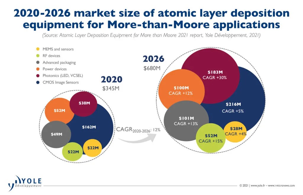調(diào)研機構(gòu)Yole Développement報告顯示,全球晶圓廠產(chǎn)能擴張的舉措正在推動ALD設(shè)備銷量的飆升。預(yù)計未來幾年,ALD設(shè)備在超摩爾應(yīng)用的市場規(guī)模將持續(xù)增長,其中2020-2026年的年復(fù)合增長率為12%,在2026年有望達(dá)到6.8億美元。