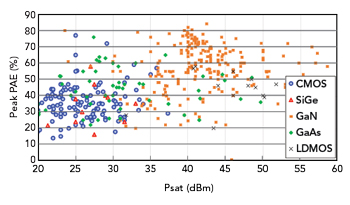 圖3 各種PA技術(shù)的Psat與PAE,在2至6GHz范圍內(nèi)測(cè)量。11