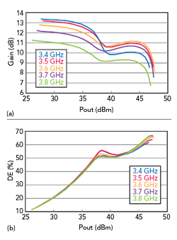 有源天線系統(tǒng)(AAS)中每個(gè)天線單元的射頻功率的一個(gè)趨勢(shì)是將PAM的標(biāo)稱線性輸出功率從3W增加到8W,可能會(huì)增加到12W甚至更高。頻率和天線陣列的大小變化對(duì)PAM的尺寸有限制,所以它要適合射頻印刷電路板(PCB)上的元件間距,以盡量降低系統(tǒng)成本。功率GaN技術(shù)支持這種緊湊的尺寸,因?yàn)樗梢猿惺芨叩慕Y(jié)溫。