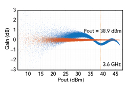 使用頻譜分析儀在3.6GHz測(cè)量了帶有調(diào)制信號(hào)并使用數(shù)字預(yù)失真(DPD)的PAM的動(dòng)態(tài)峰值功率(圖10)。測(cè)得的峰值功率為47.5dBm。該圖比較了有無DPD的調(diào)制AM-AM依賴性,顯示DPD產(chǎn)生了出色的線性輸出特性。DPD使PAM線性化的能力反映了器件低非線性和電路及器件低記憶效應(yīng)。使用市面上的DPD引擎容易實(shí)現(xiàn)線性化是器件技術(shù)和放大器設(shè)計(jì)的一個(gè)重要特征。