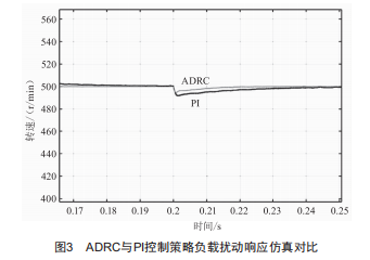 為了驗(yàn)證該調(diào)速系統(tǒng)對(duì)負(fù)載擾動(dòng)的抑制能力,在空載啟動(dòng)電機(jī)后,轉(zhuǎn)速達(dá)到500r/min時(shí),在0.2s時(shí)刻分別給電機(jī)ADRC調(diào)速系統(tǒng)和PID調(diào)速系統(tǒng)突加5N·m的負(fù)載擾動(dòng),如圖3所示,在PI控制策略下,轉(zhuǎn)速的跌落幅度達(dá)l0r/min,而在ADRC調(diào)速系統(tǒng)中,轉(zhuǎn)速的跌落幅度僅有4r/min,且在0.02s后系統(tǒng)恢復(fù)穩(wěn)定狀態(tài)。因此采用ADRC控制策略使得系統(tǒng)具有更好的穩(wěn)定性,對(duì)負(fù)載擾動(dòng)具有更好的抑制效果。