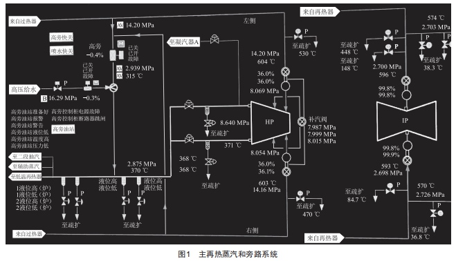 度,關(guān)閉HwL閥。同時高旁減溫水及時開啟,幅度不要過大。因軸封、吹灰、小機(jī)等用汽要求,后期高旁閥后溫度控制約320℃,保證冷再至高輔的溫度滿足要求。高旁開啟的同時,低旁及減溫水配合開啟,保持再熱器壓力目標(biāo)1.7MPa左右,不超壓超溫[3]。主再熱蒸汽和旁路系統(tǒng)如圖1所示。