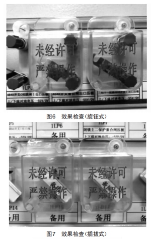 如圖6、圖7、圖8所示,分別對(duì)旋鈕式和插拔式兩種類型壓板的防護(hù)效果進(jìn)行了檢查,效果良好,在安全措施布置與拆除時(shí)間測(cè)試中,兩位員工經(jīng)過5次測(cè)試后得到的平均耗時(shí)分別為3.04s和3.1s,縮短時(shí)間的效果顯著。從圖5測(cè)試結(jié)果可見,85%的員工使用該壓板防誤閉鎖裝置布置安全措施的時(shí)間耗費(fèi)不超過4s。相對(duì)于采用傳統(tǒng)的絕緣膠布布置方式需要一段一段地取用絕緣膠布,采用纏繞等方式逐一完成粘貼,新裝置使用預(yù)先布置的底座,僅需要完成簡單的安裝操作,就可達(dá)到更快的裝拆速度。