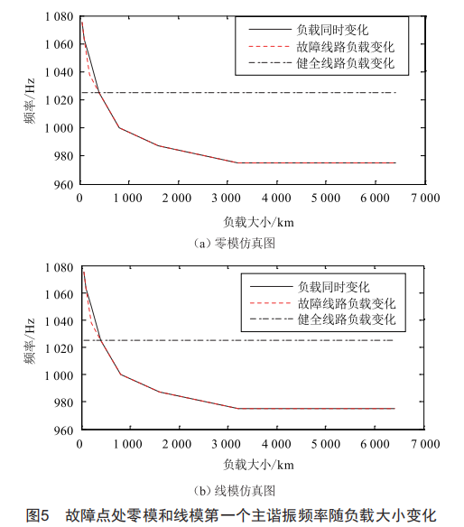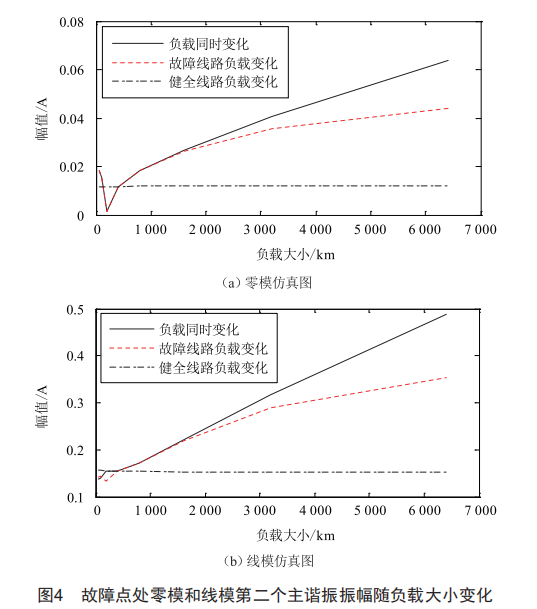 由分析結(jié)果和仿真結(jié)果可以看出,主諧振頻率的理論分析值與仿真結(jié)果有一定誤差,但主諧振頻率變化趨勢一致。故障點處零模和線模第一、二個主諧振頻率隨負(fù)載阻抗的增大而減小,幅值隨負(fù)載阻抗的增大而增大。