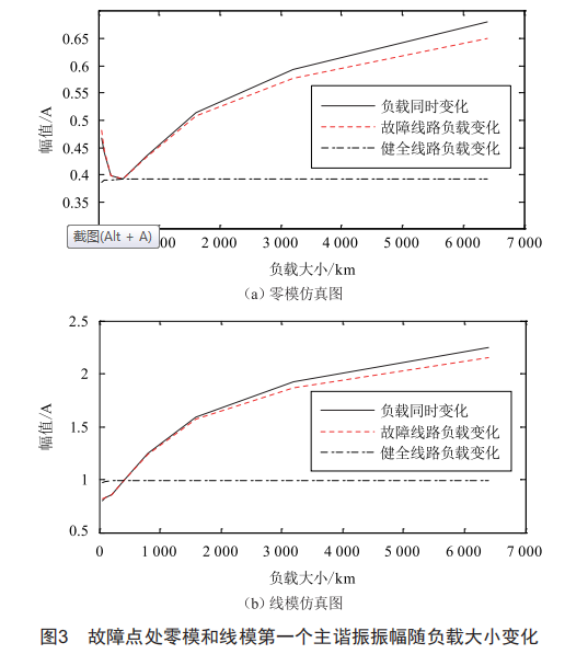 用ATP搭建中性點不接地系統(tǒng)的單相接地故障模型 , 分為3種情況進行仿真: (1)同時改變負(fù)荷阻抗大小: (2)改 變故障線路負(fù)荷阻抗 ,健全線路負(fù)荷阻抗大小不變: (3)改 變健全線路負(fù)荷阻抗大小 ,故障線路阻抗大小不變 。 仿真 窗口長度均為4個周波。故障點在故障線路(20 km)離母線 10 km處 ,按照3種情況依次改變負(fù)載大小。圖3、圖4為故障 點處零模和線模第一、二個主諧振振幅隨負(fù)載大小變化的 仿真圖 , 圖5、圖6為故障點處零模和線模第一、二個主諧振 頻率隨負(fù)載大小變化的仿真圖。