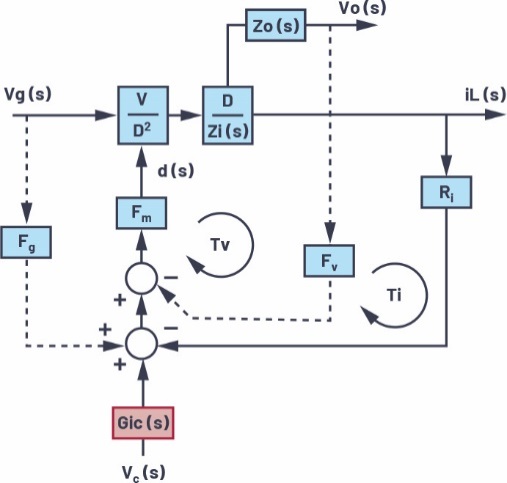 在圖5中,我們將Fv反饋環(huán)路與iL反饋環(huán)路并聯。我們也可以將Fv反饋環(huán)路作為iL反饋環(huán)路的內部環(huán)路。圖6顯示了包含附加的Gic(s)級的完整降壓轉換器模型。