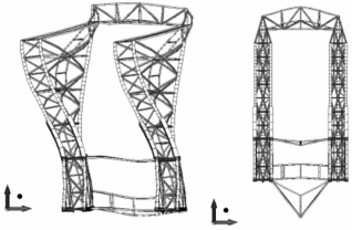 采用有限元計(jì)算軟件Femap&NxNastran建立岸邊吊機(jī)有限元模型,岸邊吊機(jī)上部為兩層的析架梁,下部立柱為由板材焊接而成的析架結(jié)構(gòu),主梁和立柱均采用梁單元模擬。圖l為岸邊起重機(jī)有限元模型。