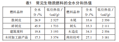 生物質(zhì)燃料以樹(shù)皮和木質(zhì)材料為主,根據(jù)地理位置和區(qū)域的產(chǎn)業(yè)鏈有所不同。以廣東省湛江市為例,常用的生物質(zhì)燃料有以下品種:散樹(shù)皮、碎樹(shù)皮、樹(shù)頭、木尾、木邊皮、建筑廢料和木材加工副產(chǎn)品。此外,還有一些不常用的燃料品種:甘蔗渣、稻谷殼、肉桂枝葉、棕櫚殼、花生殼等。常見(jiàn)生物質(zhì)燃料的全水分和熱值可參考表1。