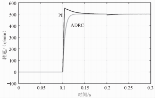 設(shè)置二階自抗擾控制器的基本參數(shù),跟蹤微分器中速度因子r=200,為了得到較好的濾波效果以及過渡過程,取h0=0.03、h=0.001。非線性控制函數(shù)fa1(·)中涉及的參數(shù)分別為α=0.2、β0=150、β1=400、β2=1000。仿真分析主要是對(duì)比自抗擾控制系統(tǒng)和PID調(diào)速系統(tǒng)的轉(zhuǎn)速調(diào)節(jié)性能。如圖2所示,電機(jī)空載啟動(dòng),在0.1s時(shí)刻參考速度突變?yōu)?00r/min,采用PI速度調(diào)節(jié)器具有較好的速度響應(yīng),經(jīng)過0.075s電機(jī)實(shí)際轉(zhuǎn)速達(dá)到參考轉(zhuǎn)速,但超調(diào)幅度較大,過渡過程長(zhǎng)達(dá)0.05s,而采用自抗擾控制策略的電機(jī)轉(zhuǎn)速具有較好的魯棒性,電機(jī)轉(zhuǎn)速達(dá)到指令轉(zhuǎn)速過程中沒有過沖現(xiàn)象,且電機(jī)完成過渡過程僅僅需要0.025s。