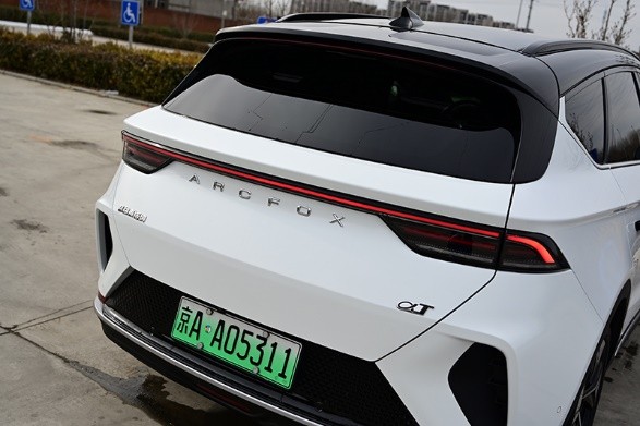 車尾略微凸起的一條“小鴨尾”看起來個性十足,立體懸浮的擾流板設計呈中間鏤空狀,為做到業(yè)界低風阻系數(shù)0.27Cd做出了貢獻。象征著北極天際線的貫穿式組合尾燈在視覺上擴展了車寬,夜間還能提供很好的視覺效果。
