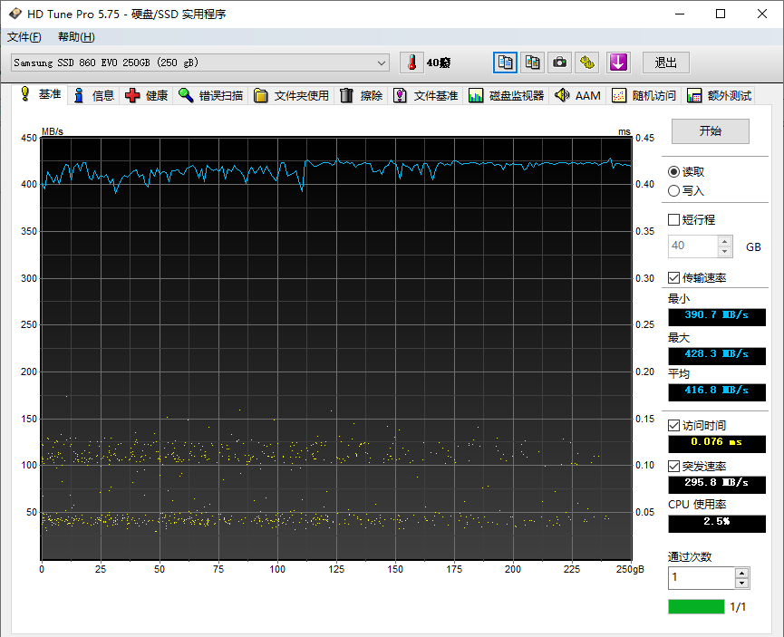 使用HD Tune進(jìn)行基準(zhǔn)讀取測(cè)試,MX500的讀取速率略低于三星860 EVO。