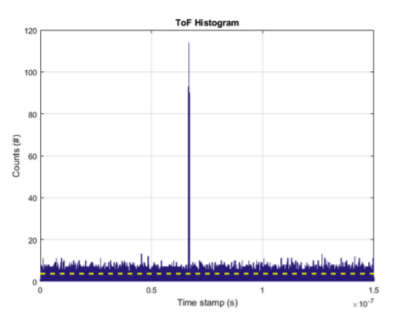 圖19. 使用Gen2系統(tǒng)參數(shù)對100米遠(yuǎn)的目標(biāo)進(jìn)行測距仿真的直方圖