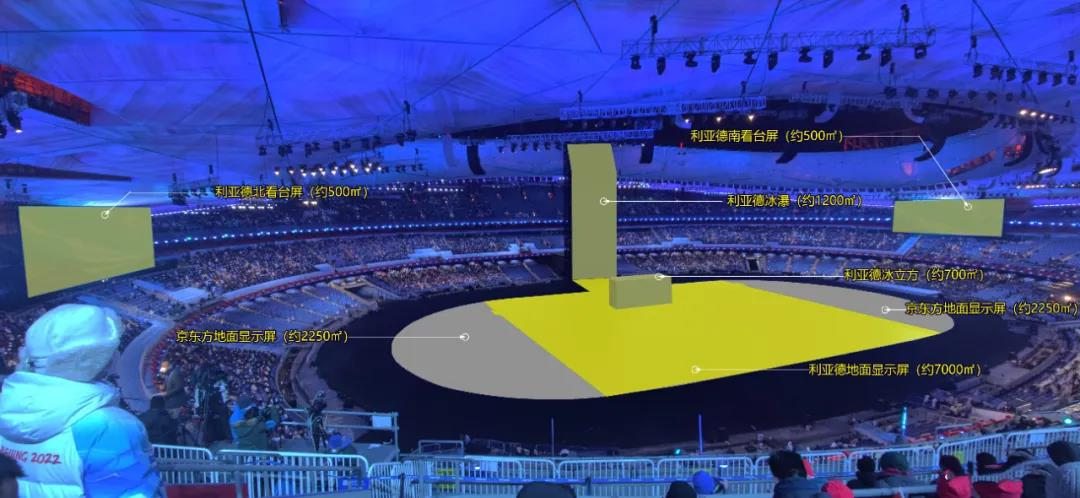 利亞德方面還專門制作了現(xiàn)場(chǎng)屏幕供應(yīng)商圖例。其中顯示,開幕式地屏作為全世界最大的LED屏幕,面積約11500平米,利亞德提供7000多平方米(圖中地屏中央黃色部分)。為舞臺(tái)增艷的1200多平方米的冰瀑,700多平方米的冰立方,以及約1000平米的鳥巢南北兩側(cè)實(shí)況轉(zhuǎn)播屏也由利亞德提供(下圖深黃色部分)。