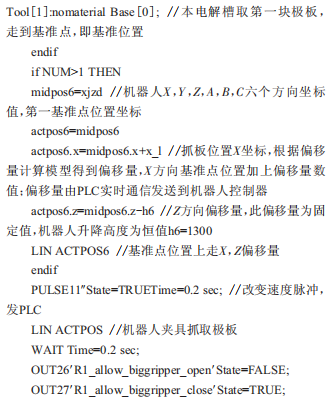 機(jī)器人夾具從電解槽內(nèi)抓取極板時(shí),其程序根據(jù)計(jì)算所得偏移量y=?(a+b+d)mm執(zhí)行,得到了很好的不工整極板位置定位,能夠順利抓取極板,完成生產(chǎn)。程序執(zhí)行過(guò)程詳見(jiàn)程序及注釋如下: