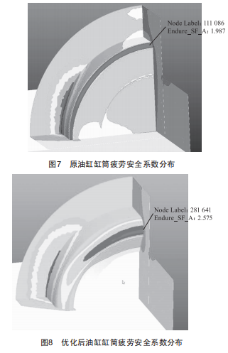 圖7為FEMFAT輸出的原油缸缸筒疲勞安全系數(shù)的分布圖,圓角處最小疲勞安全系數(shù)為1.987。圖8為優(yōu)化后油缸缸筒疲勞安全系數(shù)的分布圖,圓角處最小疲勞安全系數(shù)為2.575。從圖中可以看出,通過更改圓角結(jié)構(gòu),可以改善缸筒的疲勞工況,提高油缸的疲勞強(qiáng)度,進(jìn)一步延長油缸的壽命。