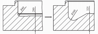 針對圖2所示的油缸,本文提出一種新的圓角結(jié)構(gòu),去優(yōu)化缸底圓角處的應(yīng)力分布。優(yōu)化后的圓角如圖3所示,圓角由R40mm優(yōu)化為R100mm,缸底厚度由280mm優(yōu)化為325mm?;钊拷椎讉?cè)需要加工凹槽,這樣加厚的缸底可以嵌入活塞里,從而不影響行程。