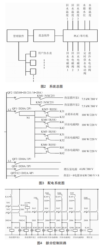 熱水控制系統(tǒng)由管理軟件、組態(tài)軟件、PLC(也可使用單片機(jī))、熱水表、傳感器、繼電器、接觸器等組成??刂葡到y(tǒng)總圖如圖2所示,配電系統(tǒng)圖如圖3所示,部分控制回路如圖4所示。
