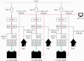 根據(jù)基本情況設(shè)計(jì)并做出模擬圖,如圖3所示,儲(chǔ)能電站自并網(wǎng)柜新建三回電纜線路將接入用戶(hù)廠區(qū)2#變電所380 v母線上網(wǎng) ,2#、4#、5#變壓器低壓側(cè)各接入500kvA ,單回路最大電流l000A,同時(shí)考慮每回線路同時(shí)充電和給用電負(fù)荷供電,按l000kvA容量計(jì)算,新建電纜型號(hào)為6×(ZRC-yJV-3 × 185+2×95)。采用無(wú)線公網(wǎng)通信方式,并向電網(wǎng)調(diào)度機(jī)構(gòu)提供并網(wǎng)點(diǎn)電流、電壓、并網(wǎng)點(diǎn)開(kāi)關(guān)狀態(tài)和發(fā)電量信息:儲(chǔ)能電站功率因數(shù)控制在0.95(超前)~0.95(滯后)且連續(xù)可調(diào)。