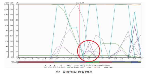 分析故障時(shí)刻車門(mén)運(yùn)動(dòng)狀態(tài)及電機(jī)電流、電壓情況,如圖2所示,發(fā)現(xiàn)滑行電機(jī)在門(mén)板關(guān)門(mén)滑行即將到位的時(shí)候 ,電流陡變?cè)龃?觸發(fā)防夾功能,防夾一次后順利關(guān)上。
