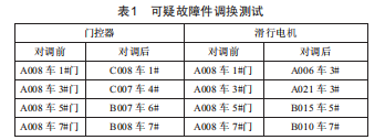 (5)電氣部件分析:將故障車4個(gè)車門(mén)的門(mén)控器和滑行電機(jī)與其他車對(duì)調(diào),對(duì)調(diào)位置匯總?cè)绫?所示,對(duì)調(diào)后故障沒(méi)有轉(zhuǎn)移,出現(xiàn)的防夾故障仍發(fā)生在同一節(jié)車同一側(cè)的4個(gè)車門(mén),所以排除是電氣部件自身故障。