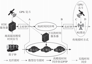 5G通信采用時分雙工制式將接收與傳送信道分離,同時為了減少上下行不一致造成的通信干擾,5G基站的空口時間偏差需做到小于3us。為使多點協(xié)作、載波聚合等站間協(xié)同技術(shù)拓展更廣闊的應(yīng)用前景,確保協(xié)同有效,5G技術(shù)要求接收不同同步采樣點信號的時間差不能超過循環(huán)前綴,根據(jù)第三代移動通信標準的要求,對于帶內(nèi)連續(xù)載波聚合,低頻信號基站的同步時間偏差需要降低到<260ns。為保證上述要求的實現(xiàn),5G網(wǎng)絡(luò)采用了高精度時間同步組網(wǎng)模型,如圖3所示。