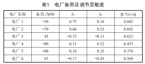 當前運行方式下對斷面調(diào)控有效的電廠為電廠1~6,各電廠對500kV AB雙線、CD雙線調(diào)節(jié)靈敏度S1、S2如表1所示。