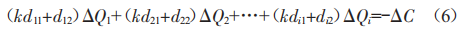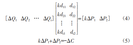 定義斷面越限值為△C,則斷面需調(diào)節(jié)量為-△C,各電廠出力需調(diào)節(jié)量為△Qi(上調(diào)為正,下調(diào)為負),線路1的調(diào)節(jié)量為△P1,線路2的調(diào)節(jié)量為△P2,k為線路L1跳閘后轉(zhuǎn)移到線路L2的轉(zhuǎn)移比,可得: