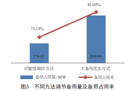 若根據(jù)電廠備用由大到小調(diào)節(jié)斷面,則電廠4調(diào)減出力80MW,有效對斷面調(diào)節(jié)量34.96MW:電廠2調(diào)減出力70MW,有效對斷面調(diào)節(jié)量48.44MW:電廠6調(diào)減出力65MW,有效對斷面調(diào)節(jié)量36.99MW:電廠5調(diào)減出力60MW,有效對斷面調(diào)節(jié)量22.56MW:電廠1調(diào)減出力24.90MW,有效對斷面調(diào)節(jié)量17.06MW:共占用備用299.90MW,占用率81.05%,完成相同調(diào)節(jié)效果,耗費備用較多,如圖3所示。