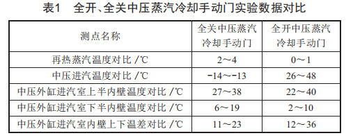 (3)實驗結(jié)論:通過實驗數(shù)據(jù)可知,全關(guān)中壓蒸汽冷卻系統(tǒng)后9號機(jī)中壓進(jìn)汽溫度整體低于10號機(jī),全開中壓蒸汽冷卻系統(tǒng)后9號機(jī)中壓進(jìn)汽溫度整體高于10號機(jī)。另外,全開、全關(guān)中壓蒸汽冷卻系統(tǒng)手動門后 ,通過9號機(jī)與10號機(jī)中壓外缸進(jìn)汽室內(nèi)壁上下溫差對比可知,全開中壓蒸汽冷卻門后 ,汽缸上下溫差增加1~13℃。因此,可判斷9號機(jī)中壓蒸汽冷卻系統(tǒng)管路中冷卻蒸汽分配出現(xiàn)異常,相關(guān)數(shù)據(jù)如表1所示(注:9號機(jī)溫度整體高于10號機(jī))。