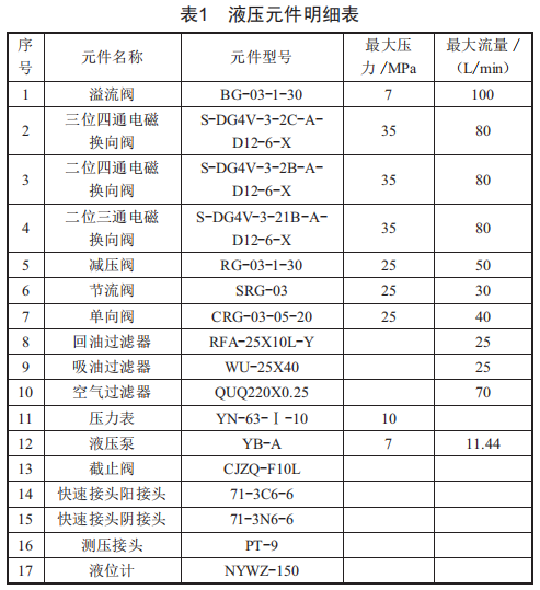 故障模擬試驗(yàn)臺(tái)液壓元件明細(xì)表如表1所示。