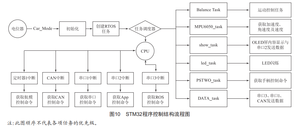 RTOS任務(wù)為每個任務(wù)賦予一個優(yōu)先級,以此來決定各個任務(wù)執(zhí)行順序。RTOS任務(wù)調(diào)度器根據(jù)任務(wù)的優(yōu)先級決定任務(wù)的執(zhí)行順序,每個任務(wù)執(zhí)行的時間很短,因此幾乎等效于所有任務(wù)同時執(zhí)行,在此期間如果發(fā)生中斷則去響應(yīng)中斷。串口2中斷用于App藍(lán)牙控制,串口3中斷用于接收ROS傳過來的信息。Car_Mode決定PWM輸出控制電機的極性,一般在出廠前已經(jīng)設(shè)置好,用戶無須更改。