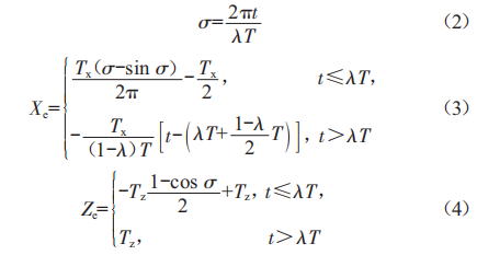 足端軌跡規(guī)劃采用Raibert提出的算法,具體地,令T為步態(tài)周期,h為支撐相占空比,則擺線軌跡為: