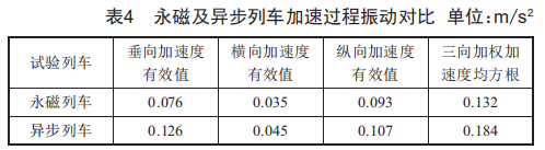 由表4試驗(yàn)數(shù)據(jù)可知,在0~45km/h加速過(guò)程中,異步列車地板垂向峰值(頻率范圍0.5~80Hz)加速度為0.353m/s2,按照Is02631標(biāo)準(zhǔn),電機(jī)上方地板振動(dòng)三向加權(quán)加速度均方根值為0.184m/s2:永磁列車地板垂向峰值(頻率范圍0.5~80Hz)加速度為0.285m/s2,電機(jī)上方地板振動(dòng)三向加權(quán)加速度均方根值為0.132m/s2。永磁列車的振動(dòng)明顯小于異步列車。