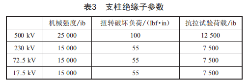 NGCP的招標文件中一般不開列各電壓等級的支柱絕緣子,這時需要設計人員根據(jù)設計經(jīng)驗開列各電壓等級的支柱絕緣子。絕緣子應包含各電壓等級配電裝置場地的支柱絕緣子、主變場地包含中性點安裝的支柱絕緣子、主變低壓側(cè)母線安裝處支柱絕緣子,絕緣子型號可依據(jù)招標文件中的TDS文件中絕緣子的參數(shù)決定,具體如表3所示。
