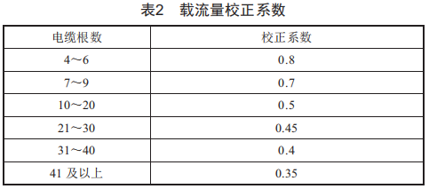 菲律賓電氣規(guī)范Phi1ippineE1eclrica1COde中表3.10.1.16和3.10.1.15(b)分別給出了環(huán)境因素下電纜載流量及不同敷設條件下載流量校正系數(shù)。查表3.10.1.16可知銅芯和鋁芯電纜在不同環(huán)境溫度下的載流量,查表3.10.1.15(b)可知電纜在空氣中多根并列敷設時載流量的校正系數(shù),具體如表2所示。