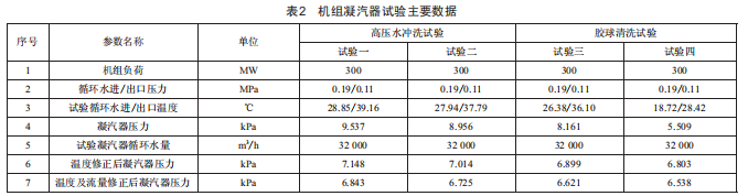 該機組為東方汽輪機有限公司制造的300Mw亞臨界、單軸、雙缸雙排汽、一次中間再熱、高中壓合缸汽輪機,配套的是N-17800-1型單背壓、單殼體、雙流程、表面式凝汽器。該機組檢修期間,在進行膠球集中發(fā)球改造的同時,使用高壓水對凝汽器進行了沖洗。為了驗證膠球清洗效果,在檢修啟機后和投運膠球兩個月后分別進行了對比試驗。試驗在300Mw額定負荷且兩次試驗真空嚴密性均為30Pa/min的情況下進行,試驗主要數(shù)據(jù)如表2所示。