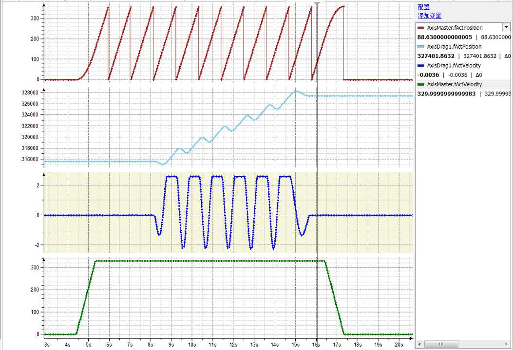 為配合不同料長(zhǎng)和印刷版長(zhǎng),牽引輥的動(dòng)作速度為同步速度-加減速-同步速度。需要屯料機(jī)構(gòu)平緩放料動(dòng)作,使得放料變頻器勻速運(yùn)行。屯料機(jī)構(gòu)動(dòng)作中反饋模擬量信號(hào)給控制器,控制器PID計(jì)算后,調(diào)節(jié)變頻器頻率,使得屯料機(jī)構(gòu)始終運(yùn)行在模擬量信號(hào)范圍內(nèi),保持放料張力的穩(wěn)定。