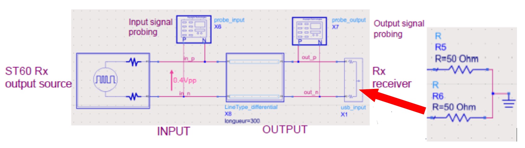 信號衰減。越長的PCB走線對信號的衰減越大。如下圖所示,ST60接收器芯片的SLVS Driver輸出端連接一段差分PCB走線(這里以常用的FR4板材為例),用示波器分別測量PCB輸入端波形和PCB輸出端波形,來看一看不同長度PCB走線對于SLVS信號的影響。SLVS Driver輸出差分電平設(shè)為缺省值400mv。