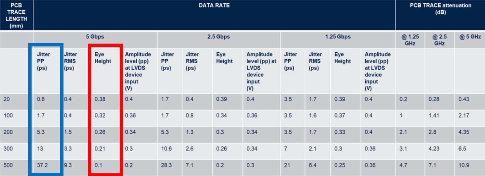 對抖動的影響。長的PCB走線會帶來更多的熱噪聲,這會增加抖動。如上圖藍(lán)框所示,5Gbps速率時,PCB走線長度從20mm變到300mm,抖動從0.8ps增加到13ps。5Gbps信號0.375UI抖動門限是75ps。300mm的PCB走線帶來的13ps抖動雖然遠(yuǎn)遠(yuǎn)小于75ps,但這僅僅是PCB走線引起的抖動。實際情況,如上面筆記本項目,SLVS走線很可能會經(jīng)過幾個電路板、接插件,難免會帶來串?dāng)_、不連續(xù)等效應(yīng),實際抖動情況遠(yuǎn)比簡單的PCB走線嚴(yán)重。