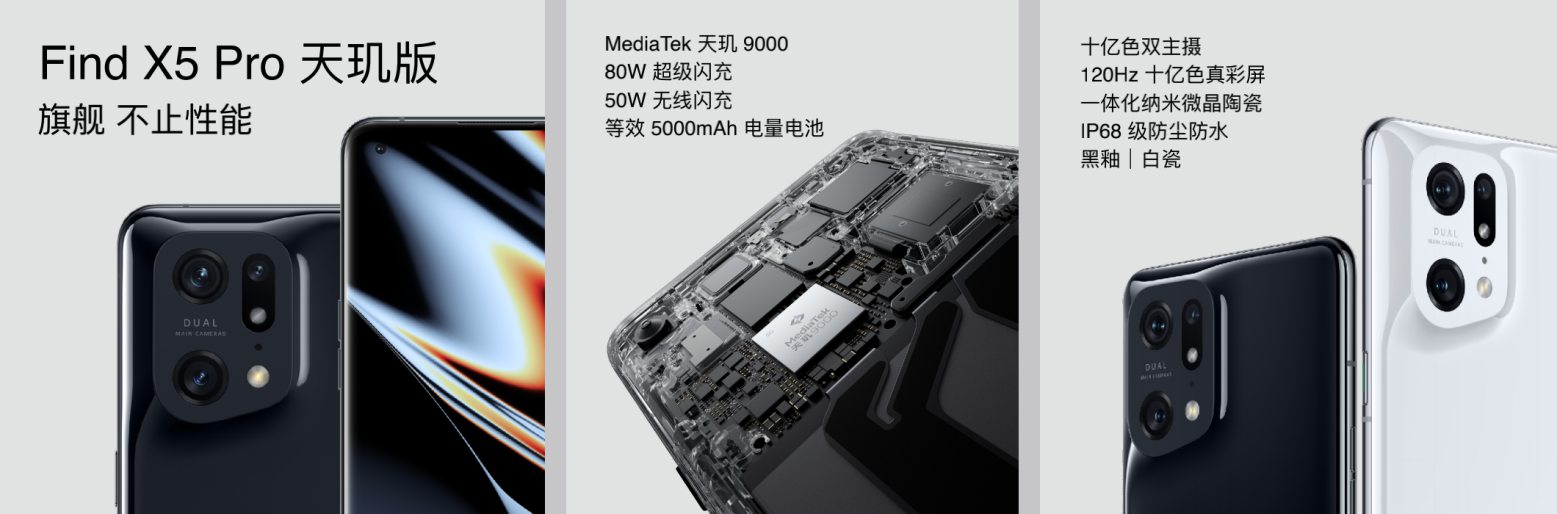 本次發(fā)布OPPO Find X5系列共有Find X5 Pro、Find X5 Pro天璣版、Find X5三款機型,F(xiàn)ind X5 Pro搭載全新一代驍龍8移動平臺,F(xiàn)ind X5 Pro天璣版首發(fā)天璣9000移動平臺,同樣采用一體化納米微晶陶瓷,支持IP68級防水防塵,2K分辨率、120Hz刷新率的頂級屏幕,80w有線閃充、50w無線閃充及5000mAh的大容量電池能時刻為這顆旗艦性能芯片保駕續(xù)航。Find X5搭載高通驍龍888移動平臺,搭載了IMX766雙主攝旗艦傳感器,同時保留馬里亞納MariSilicon X和哈蘇影像的加持,依舊帶來驚艷的旗艦影像體驗。