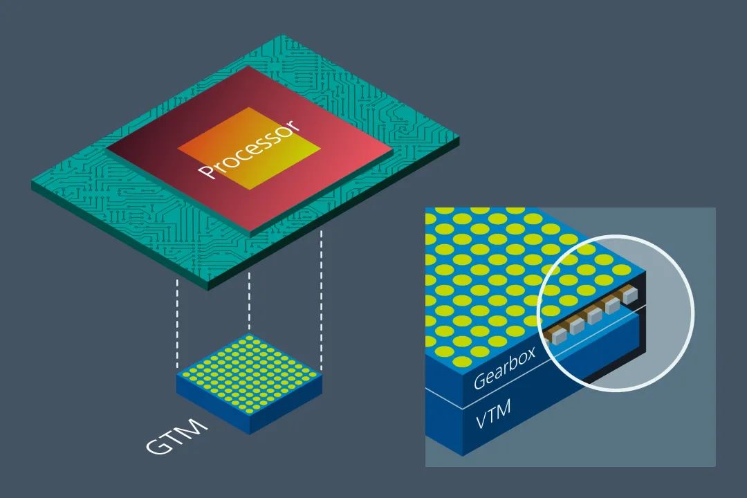 圖 2:垂直電源傳輸方案 GTM? 搭配電流倍增器置于處理器下方,最大限度地提高電源傳輸性能。垂直電源傳輸(VPD)解決方案還為包括更高 I/O 路由、板載內(nèi)存或更緊密的處理器集群在內(nèi)的方案設(shè)計(jì)大大減少了外圍器件應(yīng)用數(shù)量。
