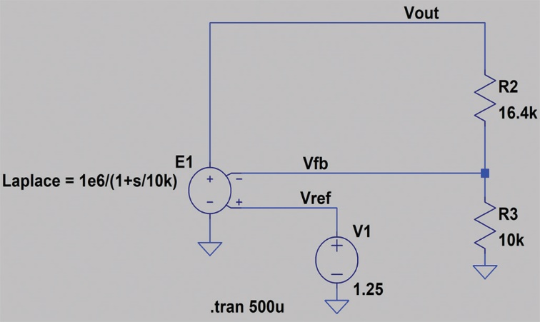 圖6顯示DC-DC轉(zhuǎn)換器的LTspice仿真原理圖,使用壓控電壓源來(lái)模擬閉環(huán)電壓反饋。反饋電阻R2和R3的標(biāo)稱(chēng)值為16.4 kΩ和10 kΩ。內(nèi)部基準(zhǔn)電壓的標(biāo)稱(chēng)值為1.25 V。在該電路中,標(biāo)稱(chēng)調(diào)節(jié)電壓VOUT或設(shè)定點(diǎn)電壓為3.3 V。