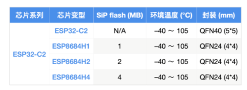 為滿足用戶多樣化的項目需求,我們計劃為 ESP32-C2 系列芯片設(shè)計多款變型,既包含 SiP flash 版本,也支持用戶自行外接 flash,詳細信息如下表所示。您可以根據(jù)項目實際情況選擇最合適的芯片進行開發(fā),構(gòu)建最具成本效益的物聯(lián)網(wǎng)方案。