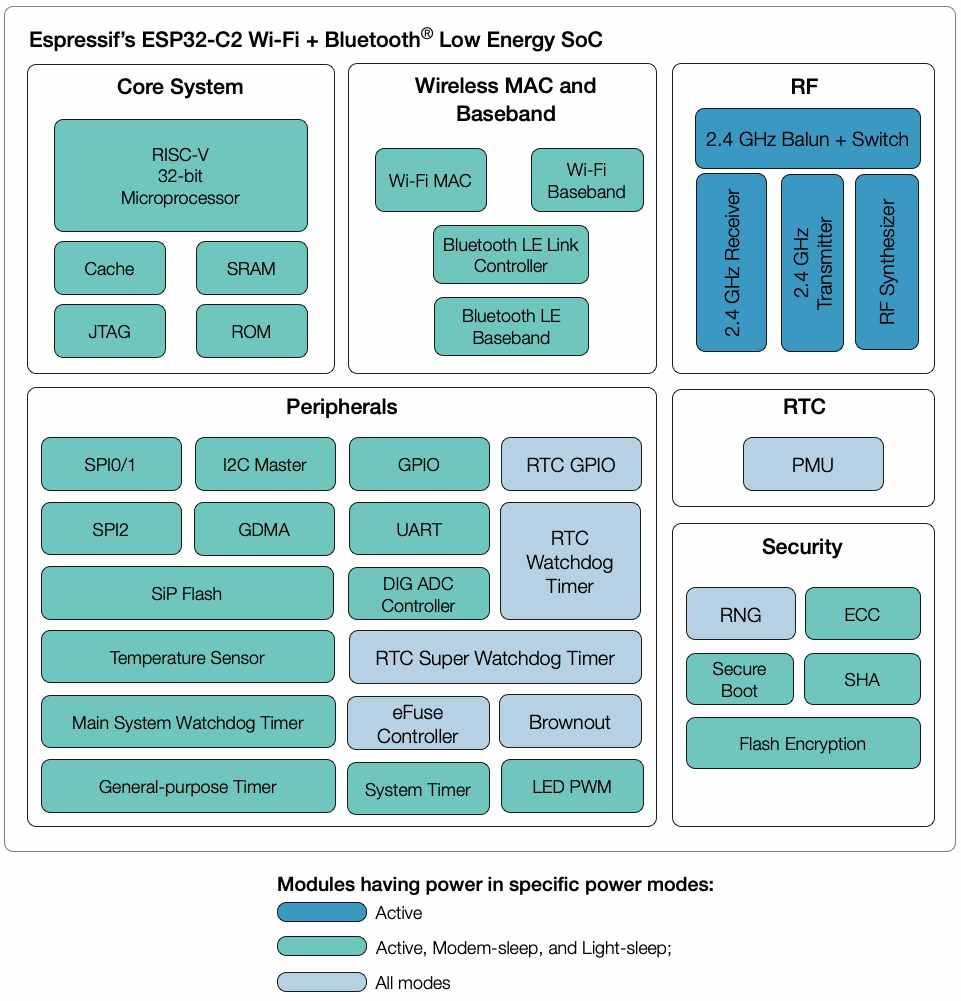 ESP32-C2 集成 2.4 GHz Wi-Fi 和支持長距離的 Bluetooth 5 (LE),搭載 RISC-V 32 位單核處理器,時鐘頻率高達 120 MHz,內(nèi)置 272 KB SRAM (16 KB 專用于 cache) 和 576 KB ROM,具有 14 個可編程 GPIO 管腳,支持 SPI、UART、I2C、GDMA 和 PWM。
