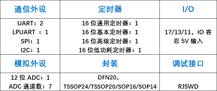芯片內(nèi)置2路串口,1路低功耗串口,1路SPI,1路I2C,豐富的通信外設(shè)讓芯片可適應(yīng)多種開發(fā)和應(yīng)用需求;內(nèi)置最多可達(dá)7個(gè)外部通道的12位ADC。