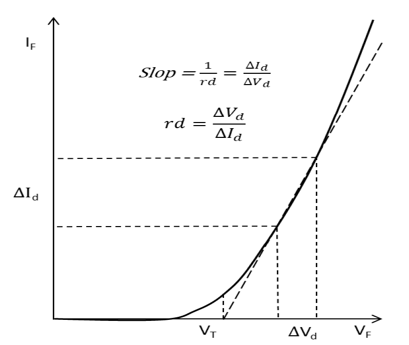 6.正向電壓(VF)。該參數(shù)表征的是二極管流過正向電流I(AV)時(shí)陽極和陰極之間的電壓差的大小,當(dāng)I(AV)增大時(shí),VF會(huì)表現(xiàn)出一定的電阻態(tài),即平均動(dòng)態(tài)電阻rd,如下圖所示,因此二極管的正向電壓值VF的值總是大于PN結(jié)的偏置電壓VT的,比如硅半導(dǎo)體二極管的VF值為1.1V大于其硅PN結(jié)的偏置電壓0.7V。
